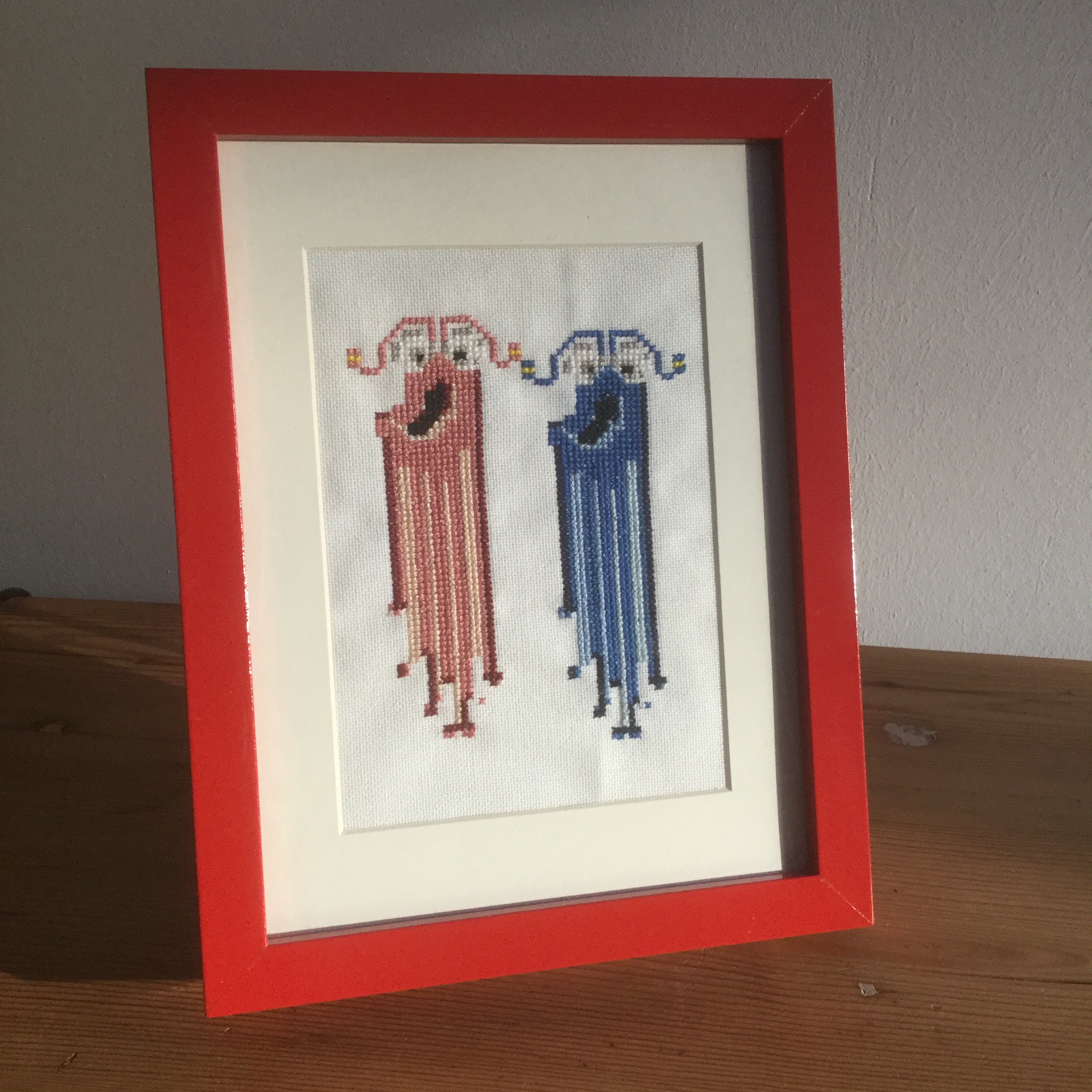Der Liebste hat ein besonderes Faible für die beiden liebenswerten Außerirdischen, und so bekam er jüngst von mir eine Umsetzung in gestickter Form. Als Kind habe ich viel und leidenschaftlich gestickt, dies war nun mein erstes Projekt nach vielen Jahren. Mit Material war ich zum Glück noch gut ausgestattet, da ich jedoch für die Farbverläufe einige Farben benötigte, musste ich an manchen Stellen doch noch nachrüsten.