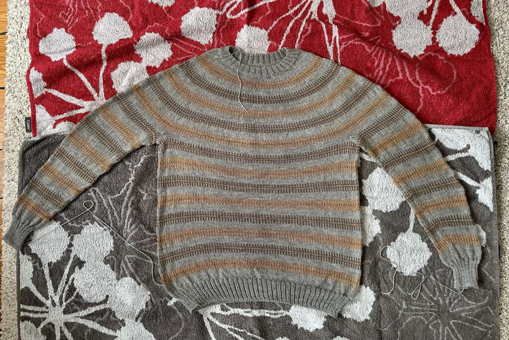 Frisch gewaschen und geblockt erreichte der Pullover schließlich genau die Maße, die ich mir erhofft hatte. Durch das italienische Abketten, das ich seit einiger Zeit verwende, erhalten die Abschlüsse eine elegante Note und eine schöne Elastizität.