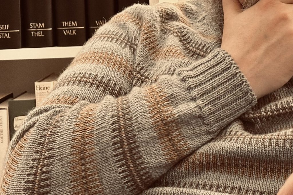 Den einfarbigen Abschnitt strickte ich sowohl am Rumpf als auch bei den Ärmeln einige Zentimeter länger.