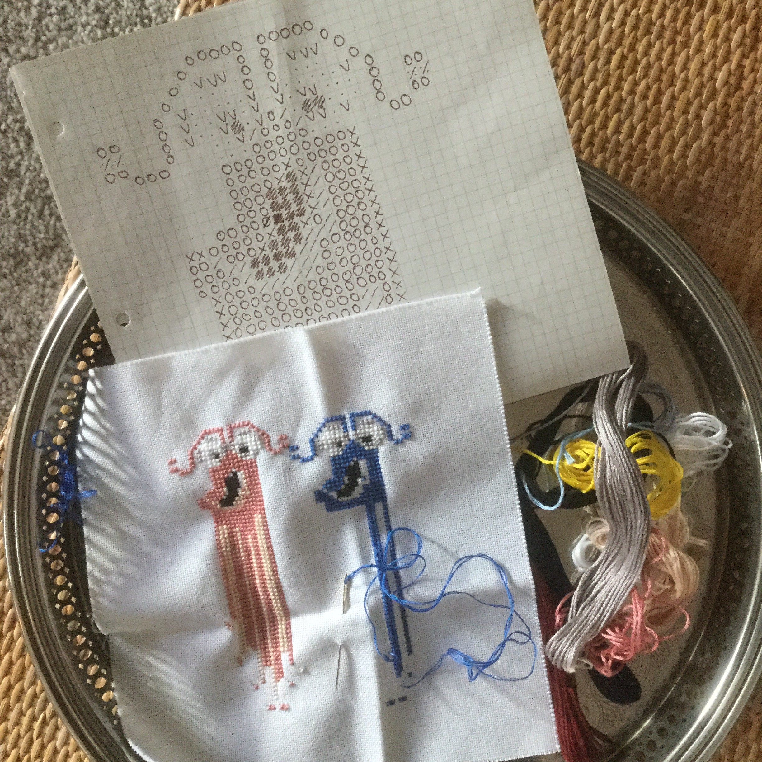 Behilflich war mir die sehr empfehlenswerte knitpro-WebApp, die ich bereits für mein Beatles-Kissen verwendet hatte. Um die Übersichtlichkeit zu verbessern, habe ich mir die noch eine eigene Anleitung erstellt, indem ich die einzelnen Farben in Zeichen übersetzt habe. Das Sticken selbst ging relativ schnell, nur etwas knifflig bei langen Reihen.